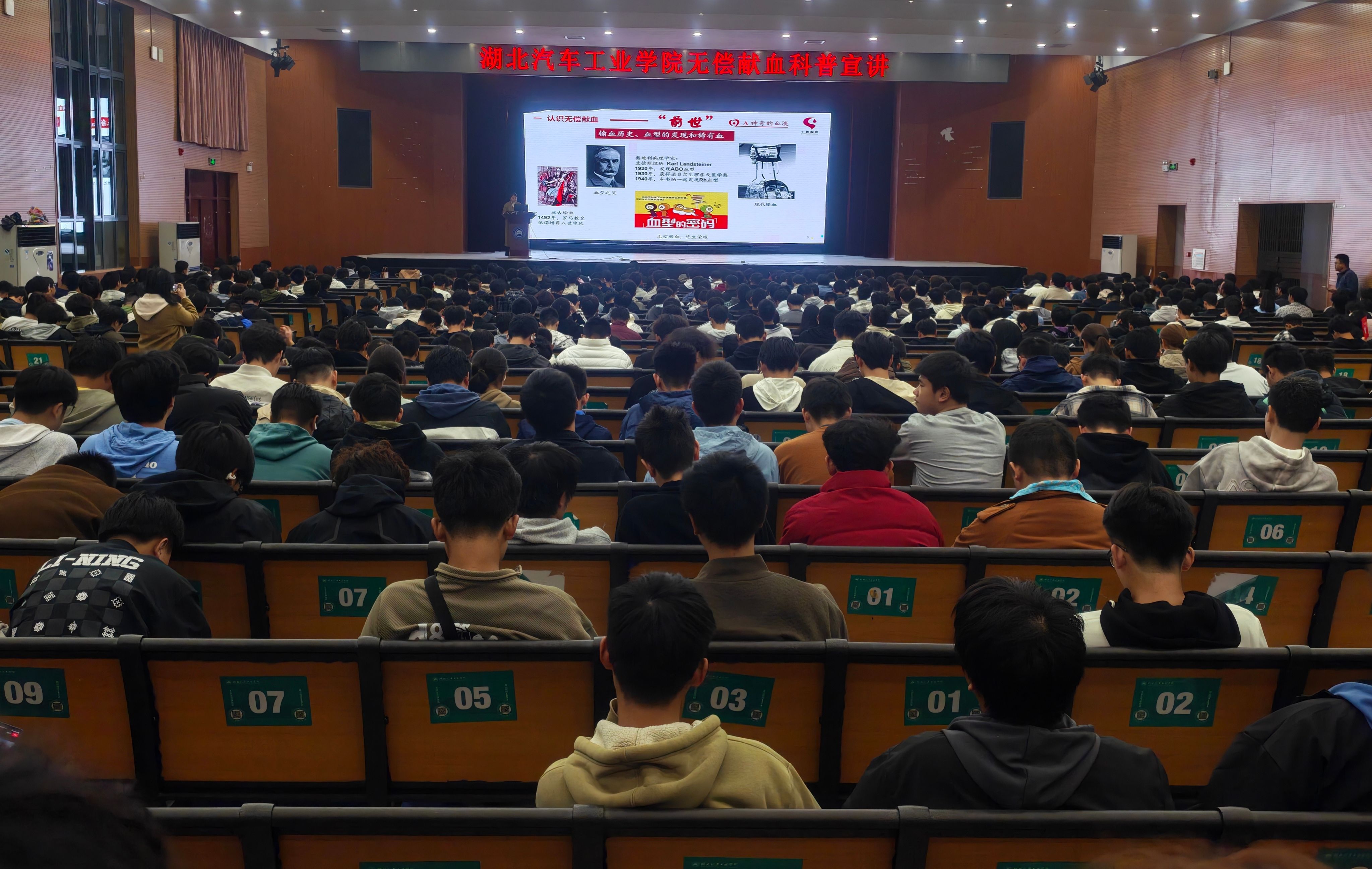本网讯(文/图 李键雯)为进一步加大无偿献血宣传力度,普及科学献血知识,广泛传播“献血有益、公益光荣”的理念,2025年10月26日晚上,汽车工程学院邀请十堰市中心血站进行无偿献血科普宣讲,为学院2025级全体新生带来一场内容详实的无偿献血科普宣讲活动。