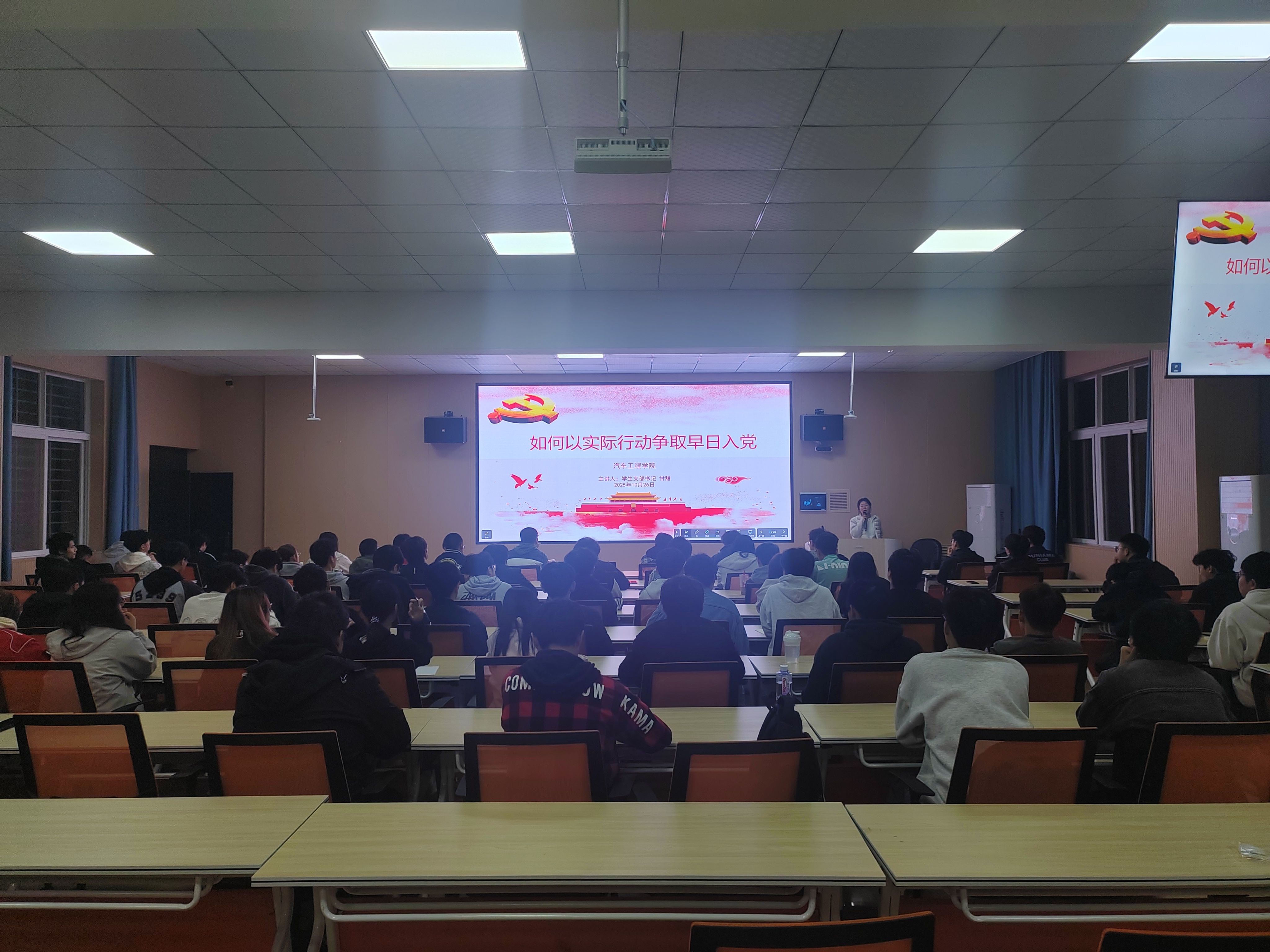 为加强对入党积极分子的培养教育,进一步提高其政治素养和理论水平,10月26日,汽车工程学院在教职工之家举行2025年秋季入党积极分子专题培训班。学院学生党支部书记甘甜主持本次培训,学生党支部委员及拟发展的50余名入党积极分子参加。