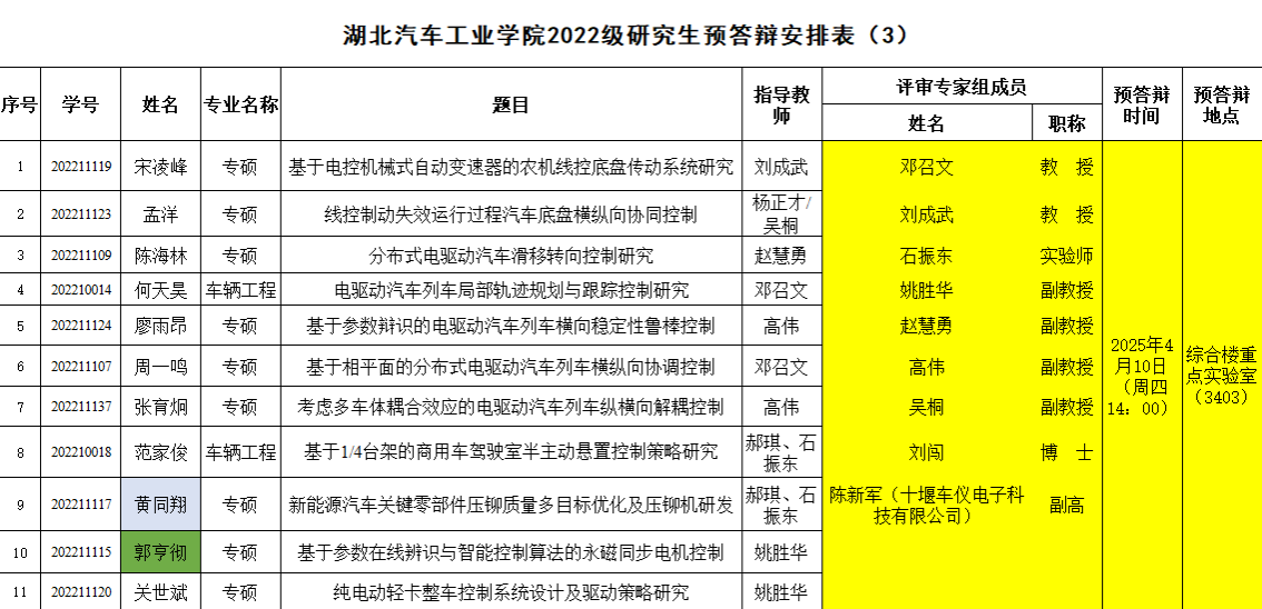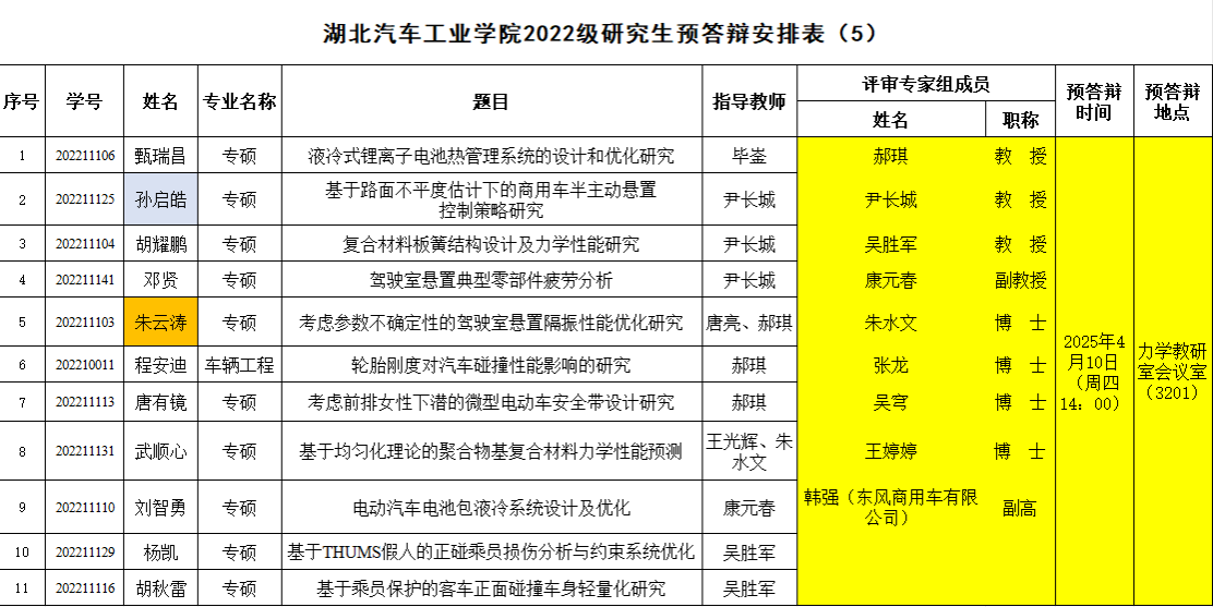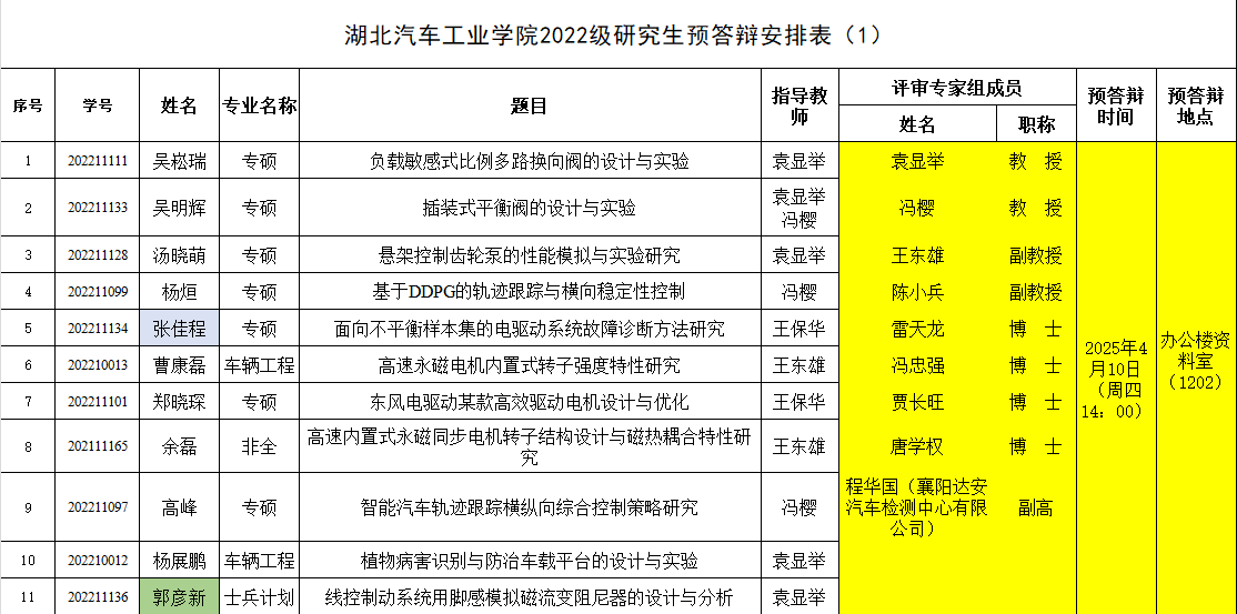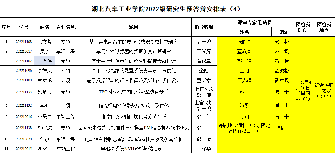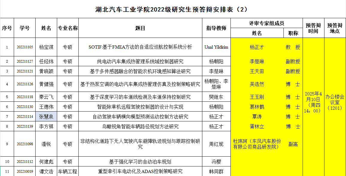 汽车工程学院2022级研究生预答辩安排
