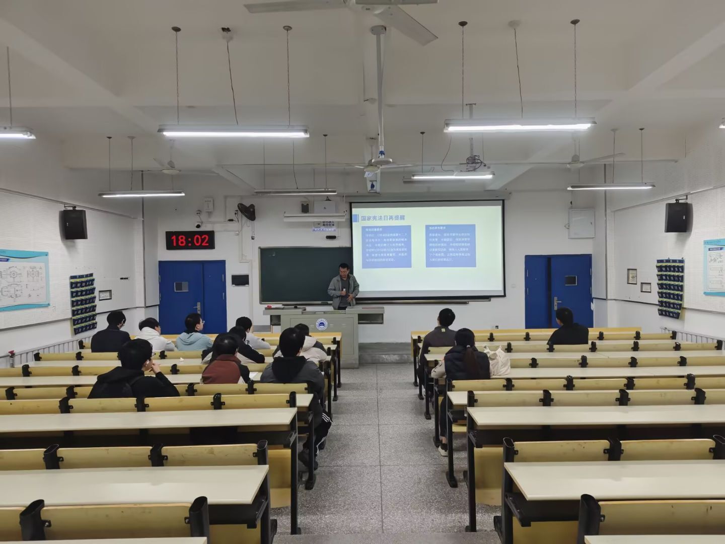 在宪法主题班会上,辅导员与班主任多措并举开展普法教育。他们通过 PPT 讲解、案例分析、播放宪法主题教育视频等形式,向学生系统普及宪法核心内容与重要意义,以及与大学生息息相关的法律知识;讲解过程中,重点结合就业权益、网络行为规范、社会交往边界等学生关注的热点领域深入解读,切实引导大家树立正确的权利义务观念。