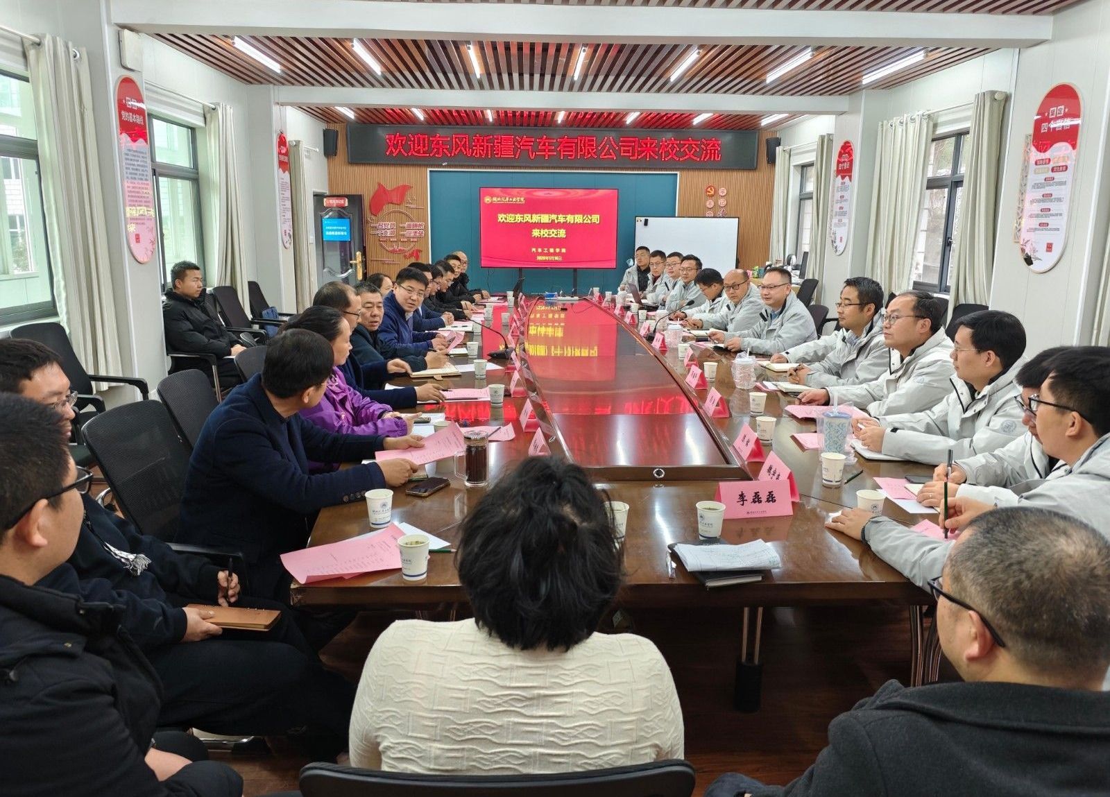 本网讯(文/图 李函)1月14日下午,东风新疆汽车有限公司研发中心总监杨洋一行莅临学校考察交流,对联合技术攻关、实验室共建、课题申报等方面进行研讨。学校汽车工程学院院长胡明茂及学院党委书记李建忠热情接待。
