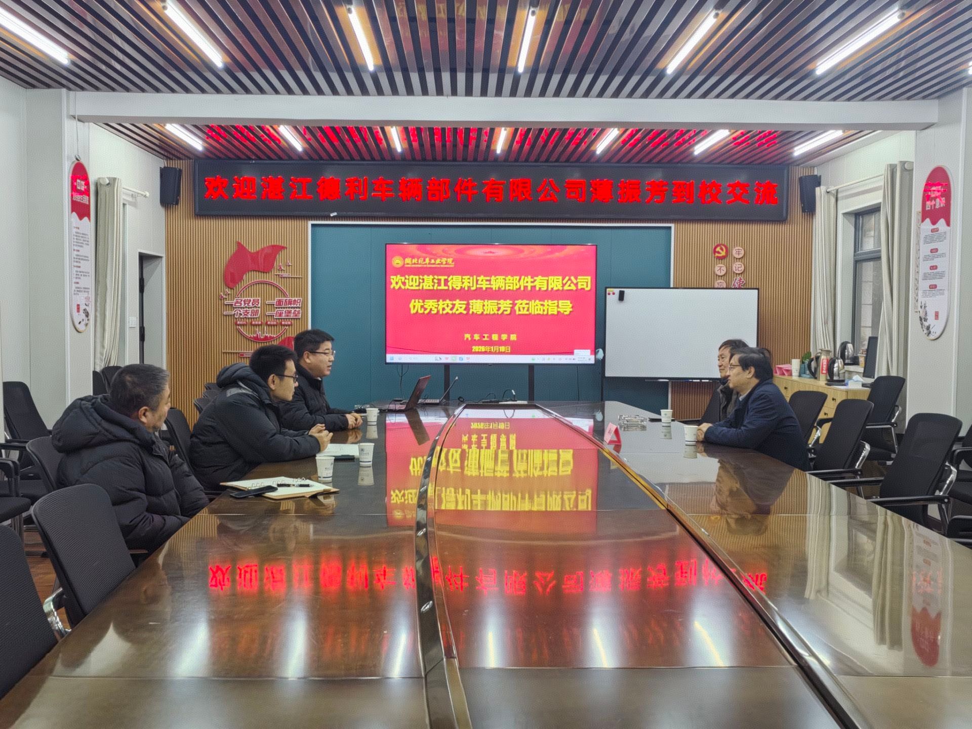 本网讯(文/图 宫雅楠/曾娇)2026年1月19日上午,湛江得力车辆部件有限公司优秀校友薄振芳经理到访湖北汽车工业学院汽车工程学院。学院院长胡明茂、副院长尹长城、院长助理王天田及李惠民老师于学院会议室1201热情接待并举行交流座谈会,双方围绕校企合作、产学研融合及人才输送等议题进行了深入探讨。
