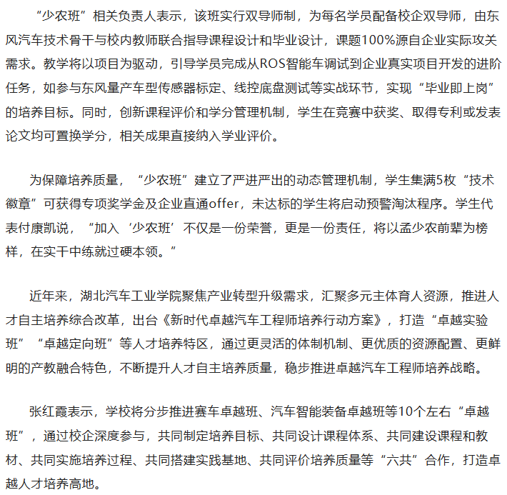 【湖北日报】湖北汽车工业学院开设“少农班”,探索校企协同育人新模式