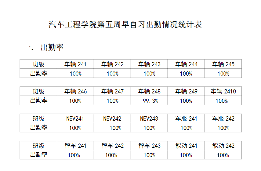 【督学正风】汽车工程学院2024-2025学年第二学期第五周早自习出勤情况