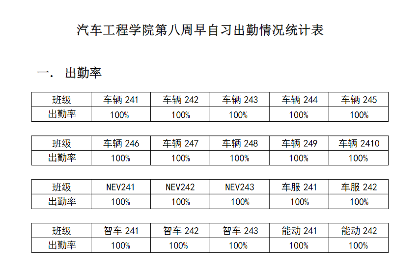 【督学正风】汽车工程学院2024-2025学年第二学期第八周早自习出勤情况