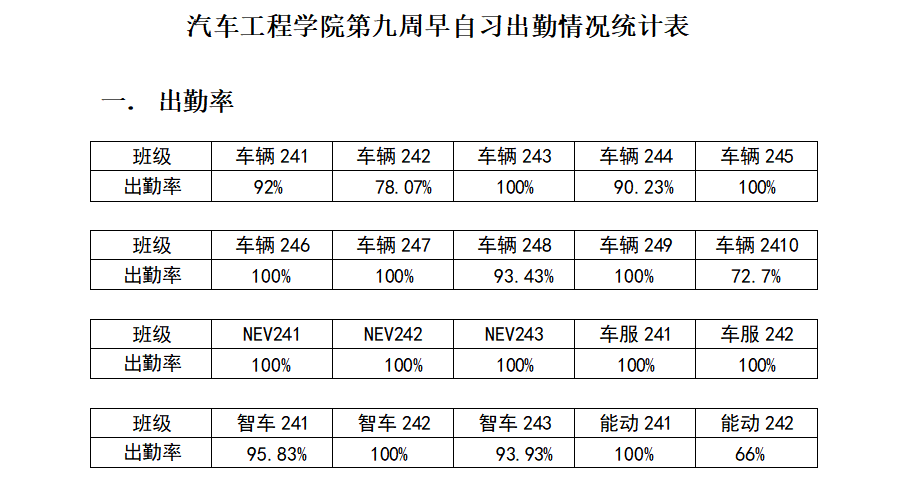 【督学正风】汽车工程学院2024-2025学年第二学期第九周早自习出勤情况