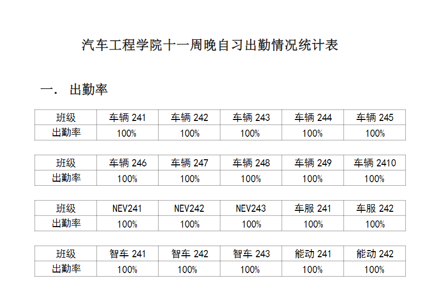 【督学正风】汽车工程学院2024-2025学年第二学期第十一周早自习出勤情况