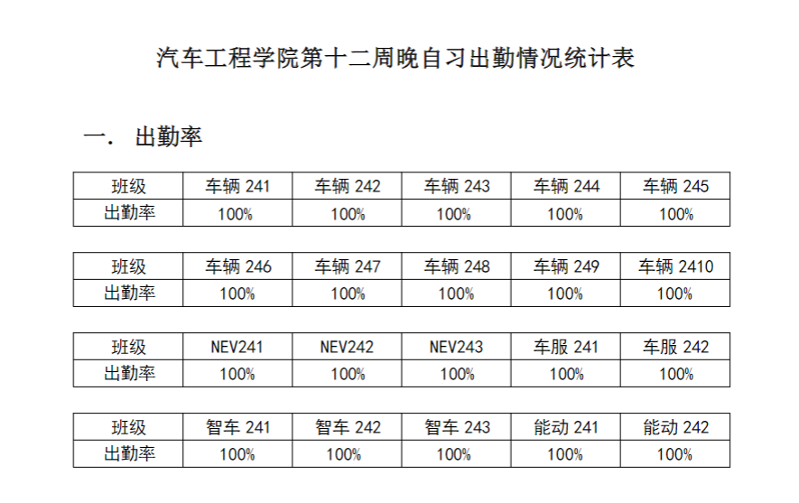 【督学正风】汽车工程学院2024-2025学年第二学期第十二周早自习出勤情况