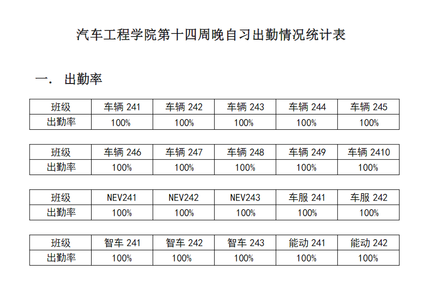 【督学正风】汽车工程学院2024-2025学年第二学期第十四周晚自习出勤情况