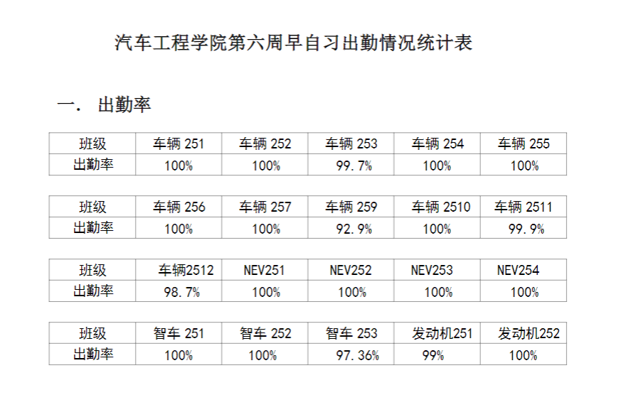 【督学正风】汽车工程学院2025-2026学年第一学期第六周早自习出勤情况