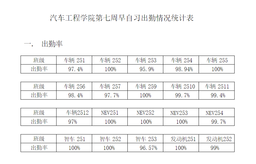 【督学正风】汽车工程学院2025-2026学年第一学期第七周早自习出勤情况