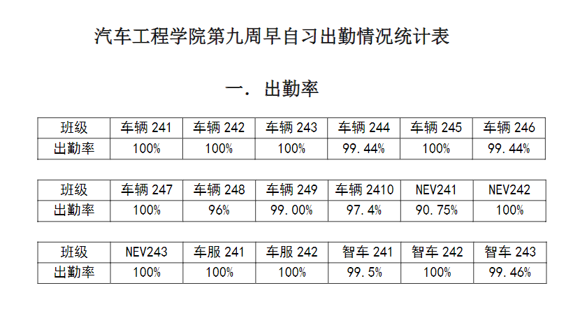 【督学正风】汽车工程学院2024-2025学年第一学期第九周早自习出勤情况