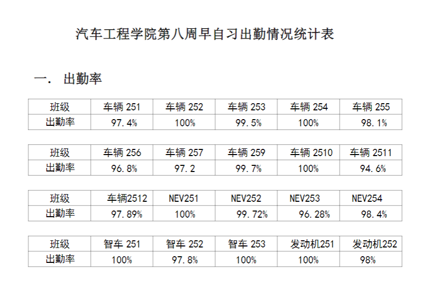 【督学正风】汽车工程学院2025-2026学年第一学期第八周早自习出勤情况