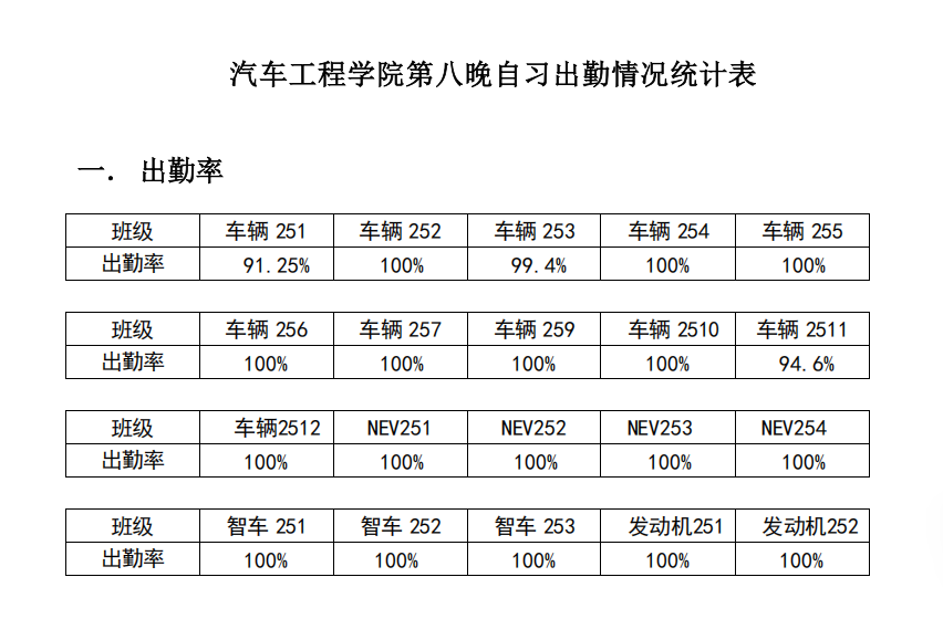 【督学正风】汽车工程学院2025-2026学年第一学期第八周早自习出勤情况